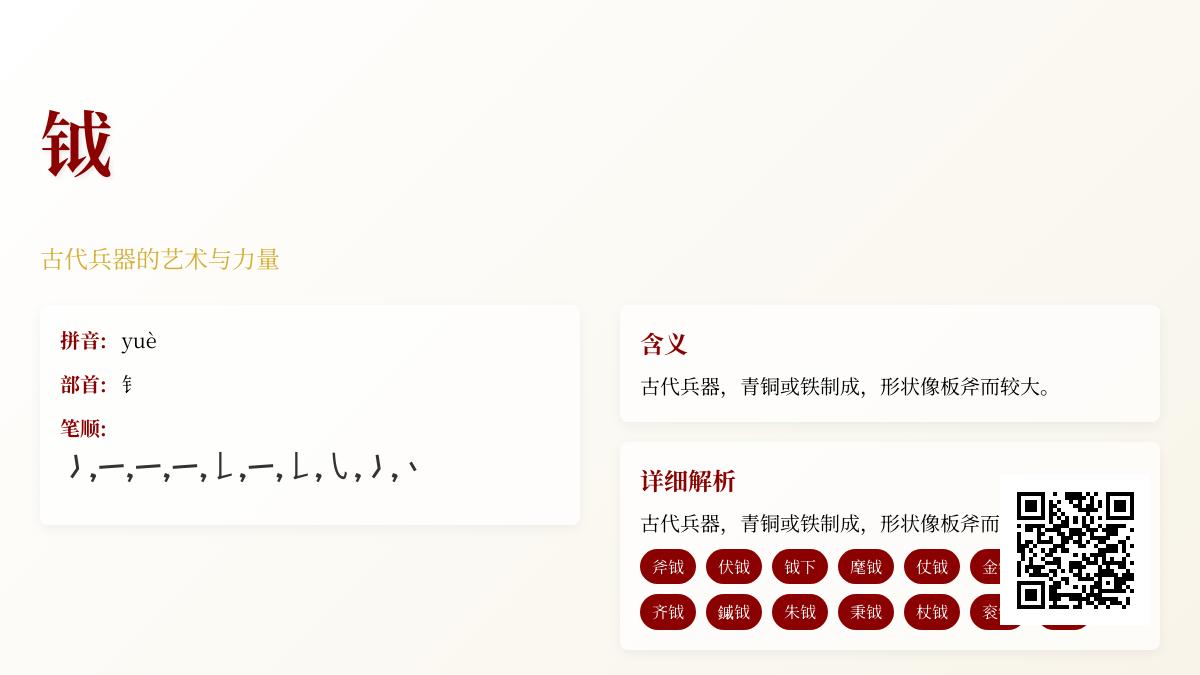 通过这些内容,我们不仅了解了”钺”这个字的基本信息,更深入认识了这种古代兵器在中国历史文化中的重要地位。钺见证了中华文明从青铜时代到铁器时代的发展历程,是研究中国古代军事、政治和文化的重要实物资料。