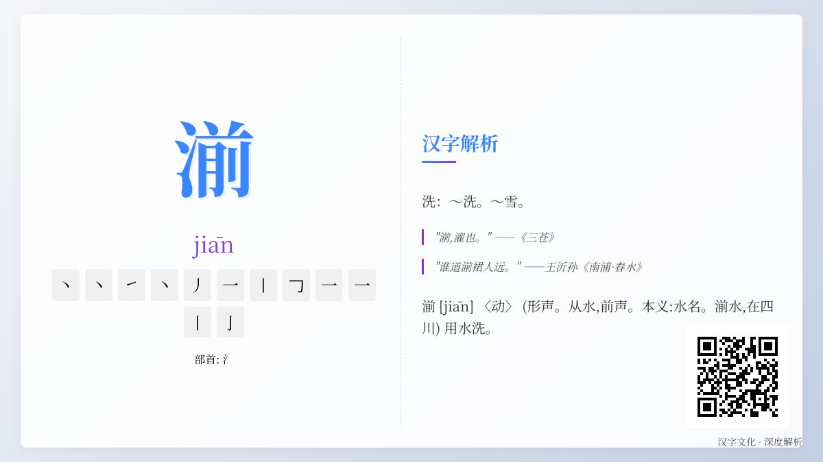 又如:湔除(洗去污秽);湔汰(洗涤);湔刷(洗刷);湔拂(清洗、涤除)